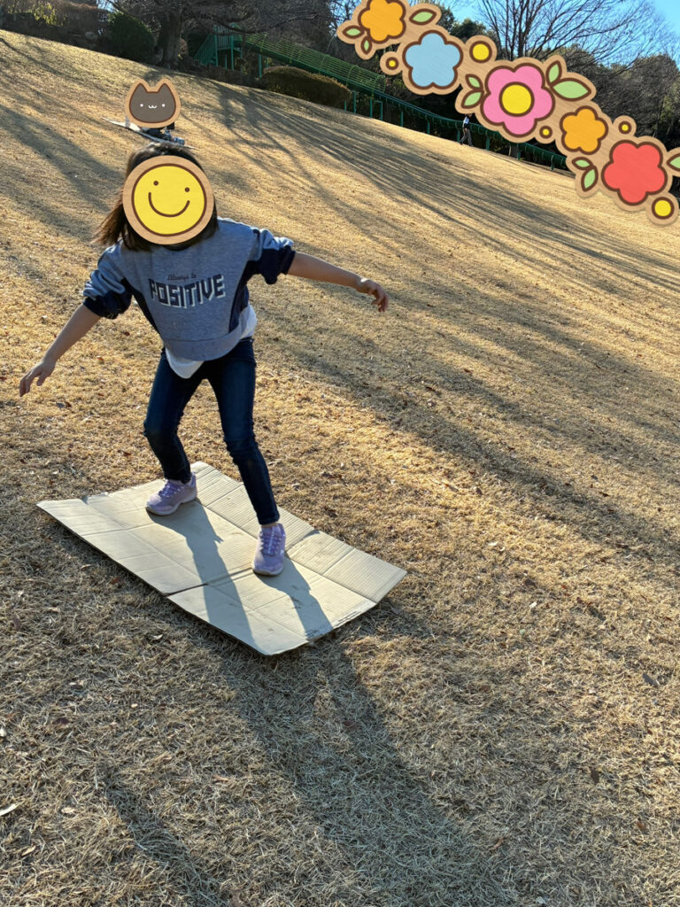 食べ終わった子たちは、今回坂滑り用に持ってきた段ボールをそれぞれ持って、坂道に全力ダッシュ!