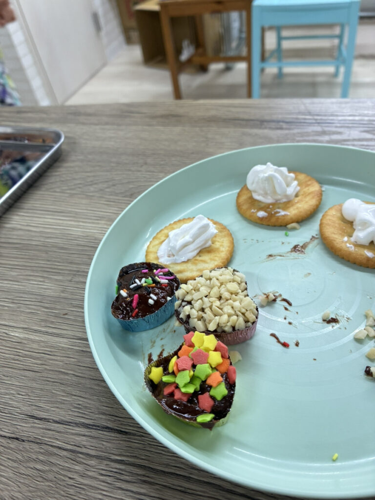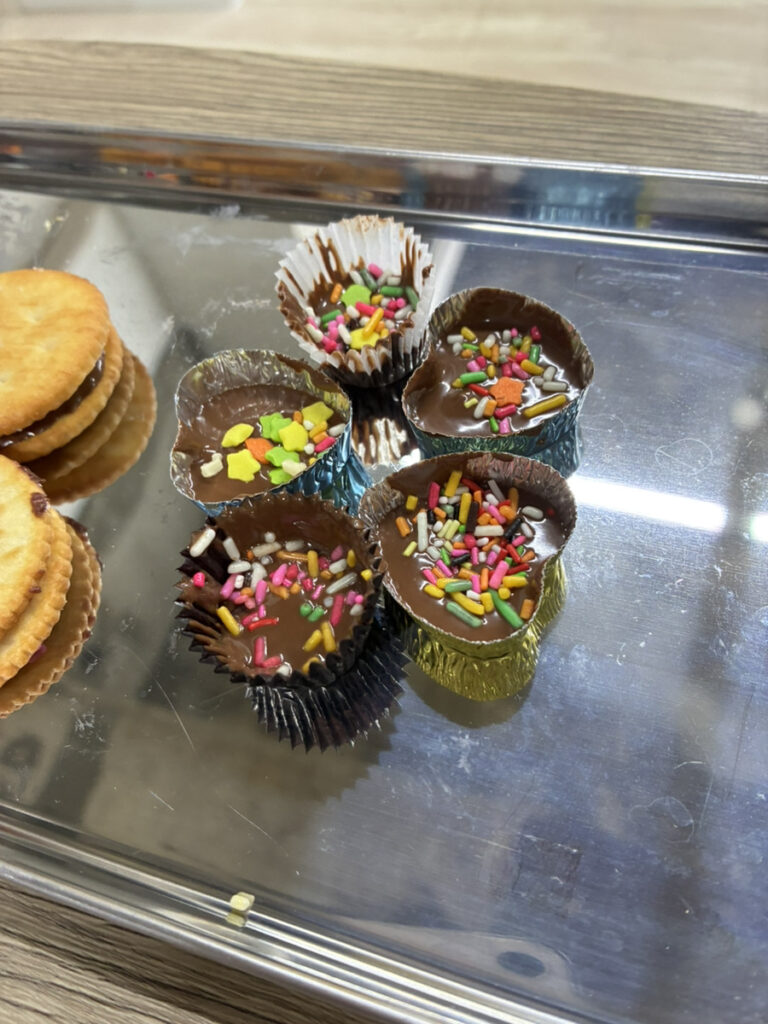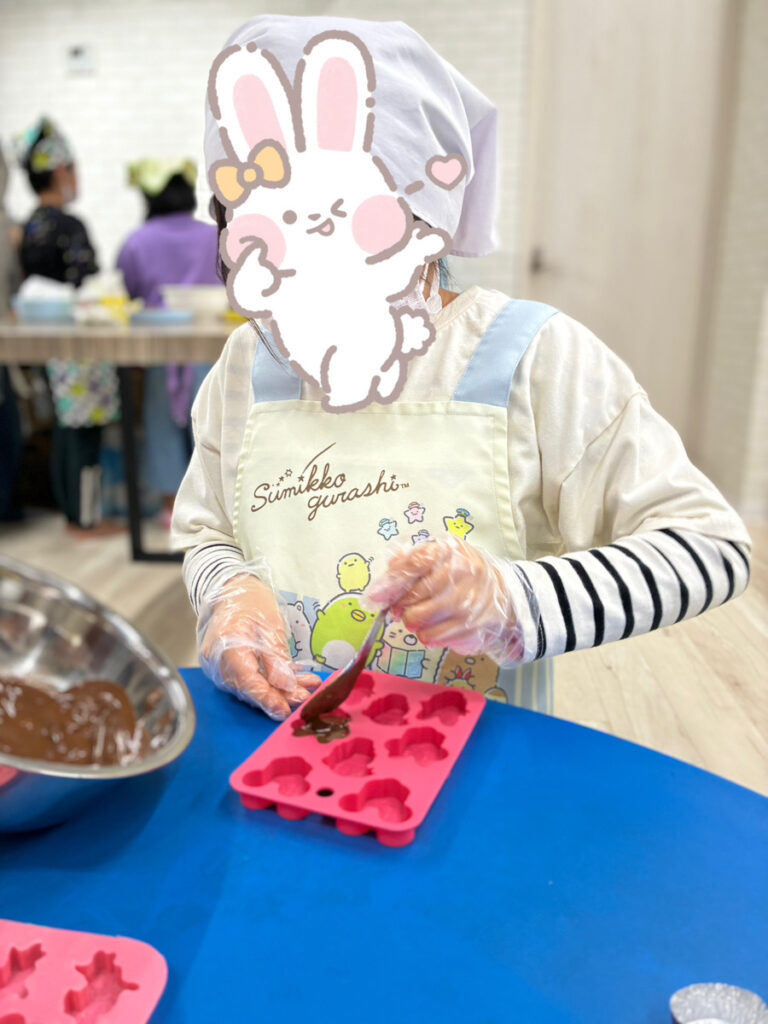 刻んだチョコレートは、本人の希望で生クリームを混ぜたり、混ぜなかったりしながら溶かし、自分たちの好きな型に流し込んでチョコレートスプレーやホイップクリームで飾り付けをしました♪