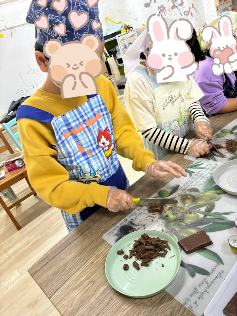 今回、市販の分厚い板チョコを買ったので、まずは子どもたちに細かく刻んでもらいました。これが子どもたちにとって一番大変そうでした…💦