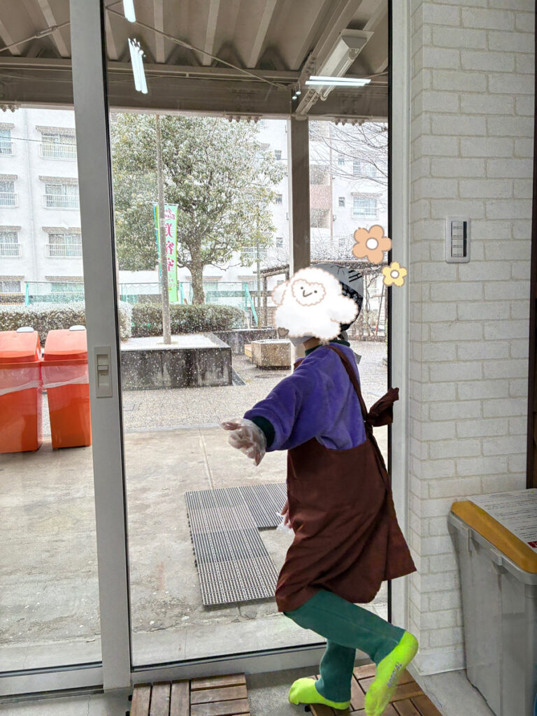 外では雪が降っていて「積もるかな♪雪合戦できる?」とワクワクしていました(*^-^*)