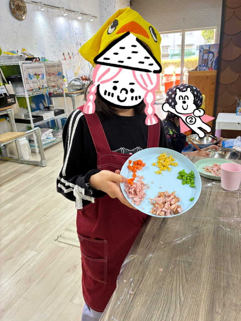 卵を溶き、ハムとウィンナーはカット。ミックスベジタブルはそれぞれの具材に仕分けしながら子どもたちが自分の好きなものをご飯に混ぜられるよう頑張っていました♪