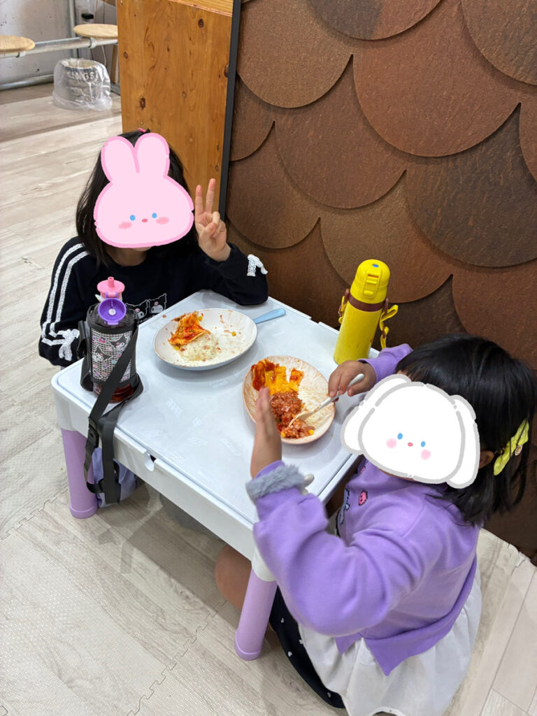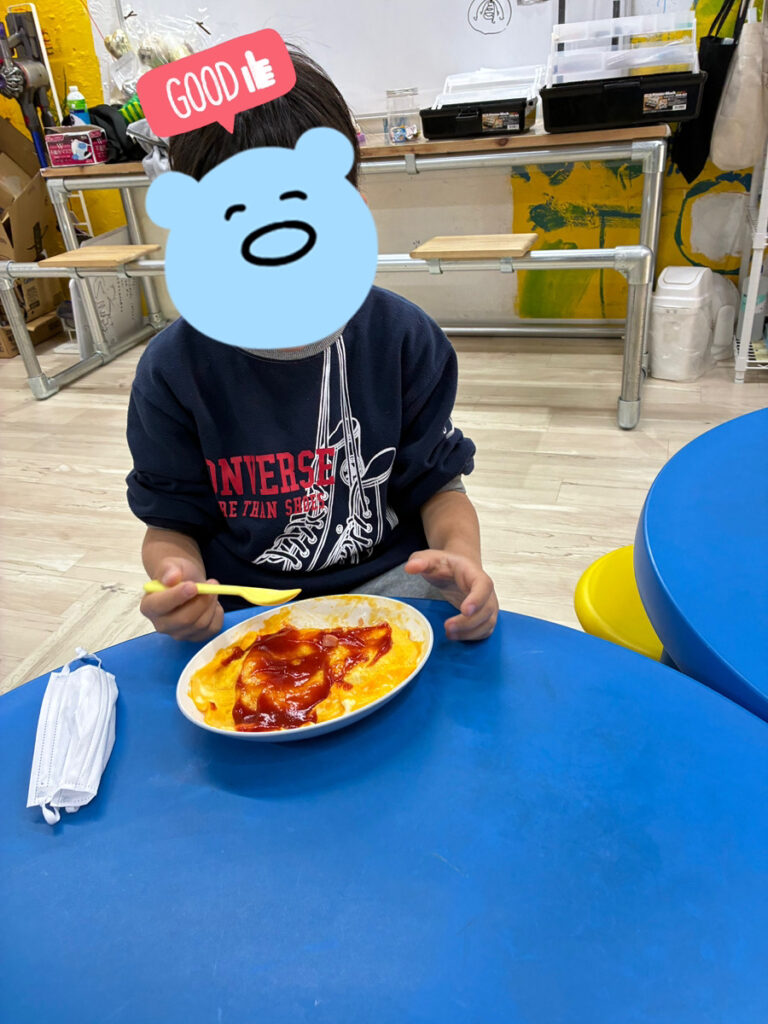 チキンライスにする子もしない子も、オムレツの上にはみんなケチャップをかけて仕上げをしていました!