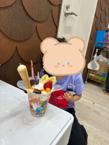 仕上げにチョコレートシロップをかけたり、アイスを乗せたりして完成です。まるで、お店の商品のように上手に仕上がりました。
